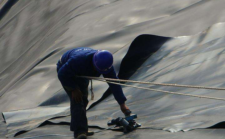 底部土工膜應盡快與邊坡上土工膜連接上,防止下雨時,雨水倒灌進入土工膜焊接成品的下面。底部土工膜的鋪焊是在邊坡土工膜鋪焊完成之后進行的。按裁好的土工膜尺寸,一幅一幅鋪設,做好記錄。在鋪設土工膜時,應邊鋪邊焊,當天鋪設當天焊完。